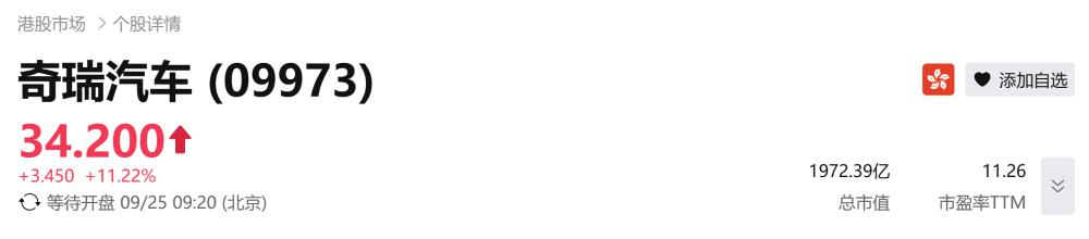 Before the market opened, Chery Automobile's Hong Kong stock surged 11.22%, priced at HKD 34.2 per share (approximately RMB 31.36), with a market capitalization reaching HKD 197.239 billion (approximately RMB 180.848 billion).