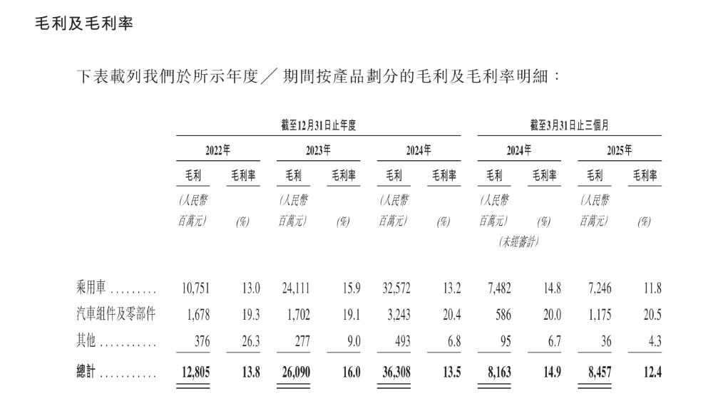 In terms of gross margin, Chery's overall gross margins for 2022, 2023, and 2024 are 13.8%, 16.0%, and 13.5%, respectively, with 12.4% for the first quarter of 2025.