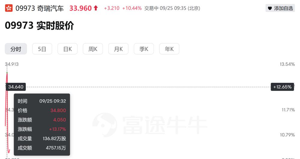 After the market opened, Chery Automobile's stock price continued to rise, with a maximum increase of 13.17%, quoting at 34.8 HKD per share (approximately 31.91 RMB). The market value once exceeded 200 billion HKD (approximately 183.38 billion RMB).