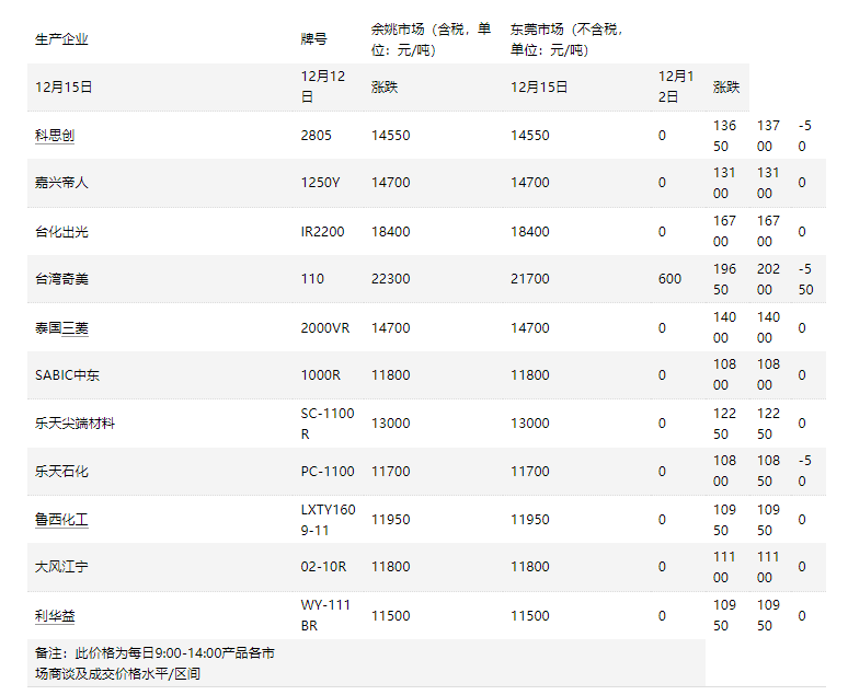 On December 15, 2025, the average price of PC in the market was 14,131 yuan/ton, an increase of 46 yuan/ton from the previous working day, with a rise of 0.33%. The domestic market for PC today mainly remained stable, while some imported materials experienced price increases due to tight supply. Prices for domestic materials stayed steady, and currently, factories do not face significant shipping pressure, with quotes still showing an upward trend. Downstream enterprises are cautious in their market entry, and there is a strong atmosphere of wait-and-see among participants, resulting in stagnant trading activity. In terms of pricing: the mainstream negotiation for low-end materials in East China is referenced at 11,500-11,950 yuan/ton, while mid-to-high-end materials are referenced at 14,550-22,300 yuan/ton.