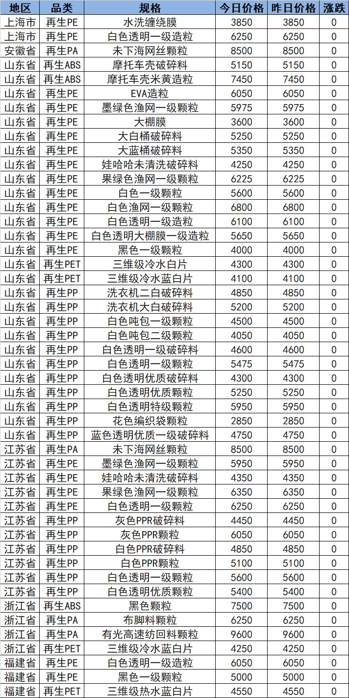 Summary: New prices for the recycled plastics market in East China on the morning of September 29th! The recycled market in East China is operating steadily and quietly. Recycled PE in Shanghai is quoted at 3850-6250, recycled ABS in Shandong is quoted at 5150-7450, and recycled PE in Jiangsu is quoted at 4350-6350. Pre-holiday stocking is basically completed, and the atmosphere of inquiries in the market has weakened. The strategy of purchasing as needed remains unchanged. It is expected that real market transactions will remain sluggish in the short term, and the market price fluctuation will be limited.