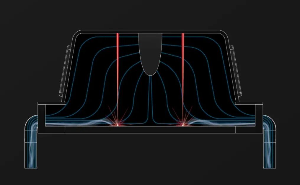 The AirSword system developed by AMCM overcomes the aforementioned limitations. In the company’s new M 8K printer and the planned M 10K and other large LPBF devices, AirSword can generate dynamic, multi-layer airflow that covers the entire printing space. The gas emitter at the center of the system divides the airflow into two opposing streams along the axis of the chamber, pushing smoke and spatter toward the exhaust openings on either side. This design prevents smoke from spreading within the chamber even during long printing processes, avoiding interference with the laser beam path.