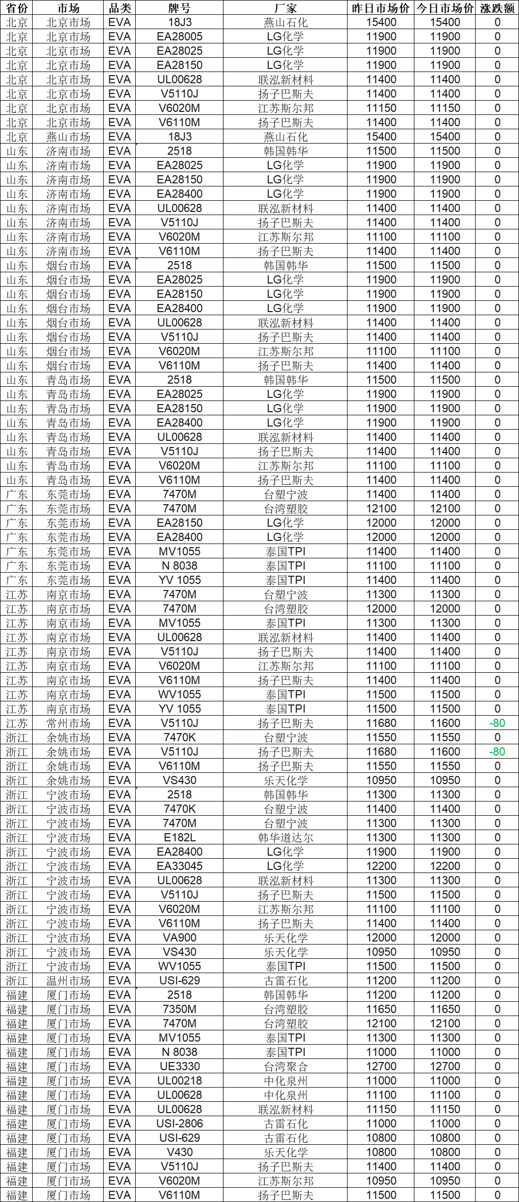 According to Zhuansu Shijie statistics, as of 11:00 AM on October 10, the EVA market across the country is steadily declining! 98% of prices in the entire market remain stable, with the largest drop being 80 yuan. Currently, the price of Yangzi BASF V5110J in the Changzhou market is 11,600 yuan. Today's overall market EVA price range is 10,800-15,400 yuan, with a market median of 11,400 yuan.