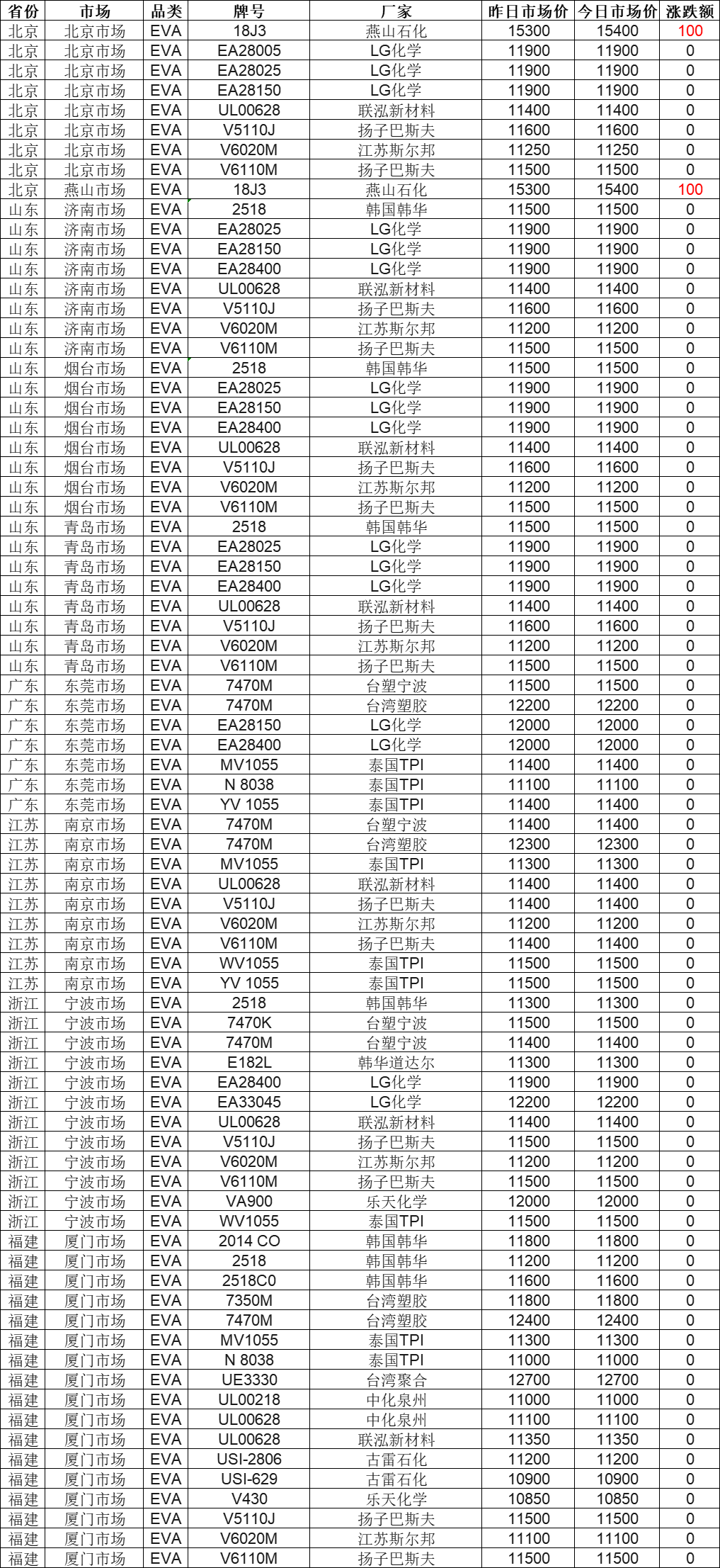 According to Zhuangsu Shijie statistics, as of 11:00 AM on September 29, the EVA market across the country is steadily rising! 97% of the market quotes remain stable, with the highest increase being 100 yuan. Currently, the Yanshan Petrochemical 18J3 price in the Beijing market is 15,400 yuan. Today's EVA market price range is 10,850-15,400 yuan, with a market median of 11,500 yuan.