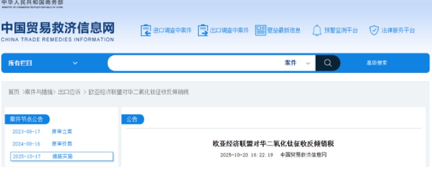 Recently, the Department for Protection of the Internal Market of the Eurasian Economic Commission issued Announcement No. 2025/454/AD38. In accordance with Resolution No. 96 of the Eurasian Economic Commission dated October 14, 2025, it imposes a 5 - year anti - dumping duty on titanium dioxide (Russian: Диоксид титана) originating from China. The specific duty rates are as follows:14.27% for LB Group Co., Ltd., Henan Billions Advanced Material Co., Ltd., LB Lufeng Titanium Industry Co., Ltd., LB Sichuan Titanium Industry Co., Ltd., and LB Xiangyang Titanium Industry Co., Ltd.16.25% for Shandong Dawn Titanium Industry Co., Ltd. and other Chinese producers.