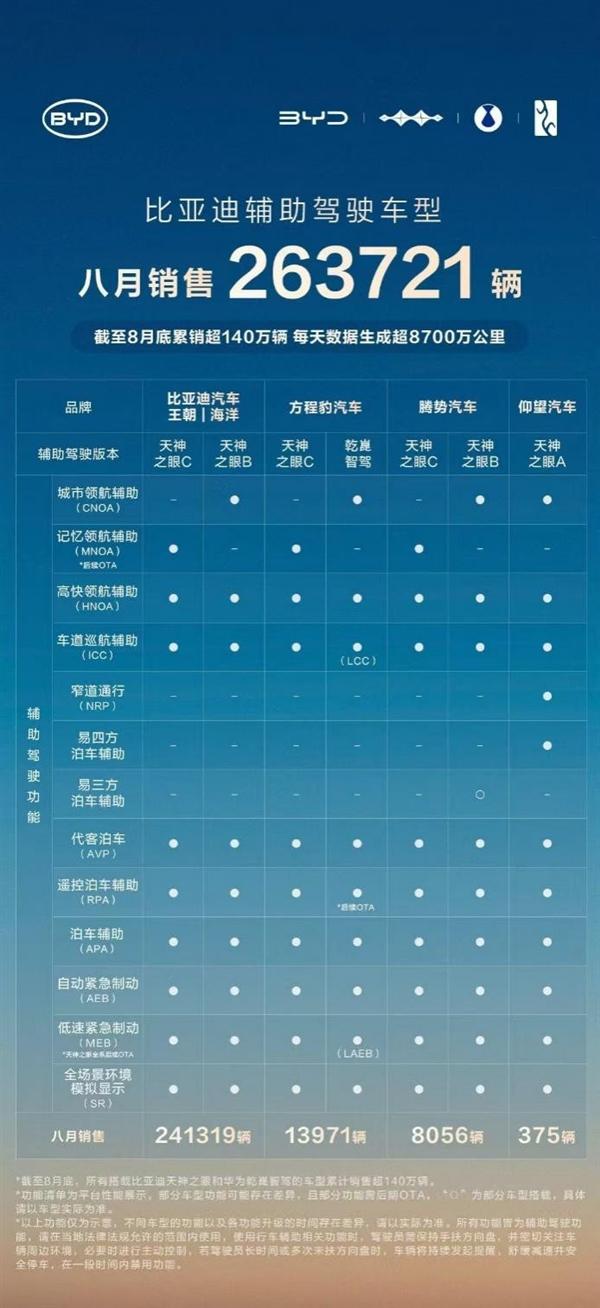 It is worth mentioning that BYD's "Tianshen Eye" assisted driving system, released at the beginning of the year, has accumulated sales of over 1.4 million vehicles. In August, the sales proportion of assisted driving models in the domestic market reached 90%, with the daily generated mileage of assisted driving data exceeding 87 million kilometers.