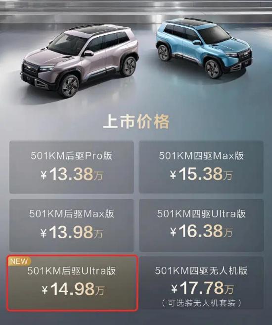 Today, we learned from the official news of Equation Leopard that the Equation Leopard Titanium 3 has officially launched the 501KM rear-wheel drive Ultra version, priced at 149,800 yuan. The new car offers consumers the option of micro-light pink and ice crystal blue paint colors.