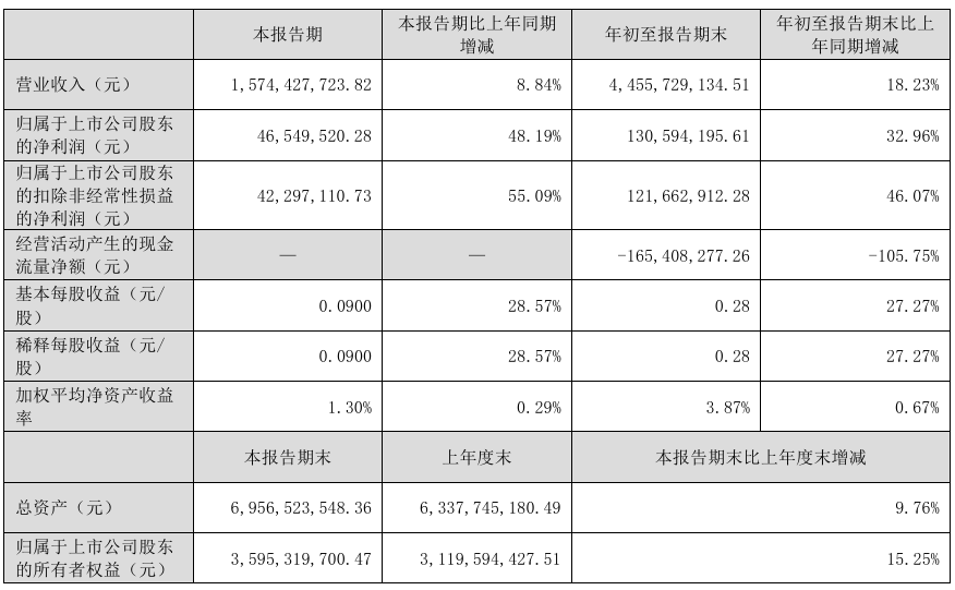 From the beginning of the year to the end of the reporting period, the company achieved a total revenue of 4.455 billion yuan, an increase of 18.23% year-on-year, and a net profit of 131 million yuan, with a growth rate of 32.96%, demonstrating a continuous enhancement in core profitability.