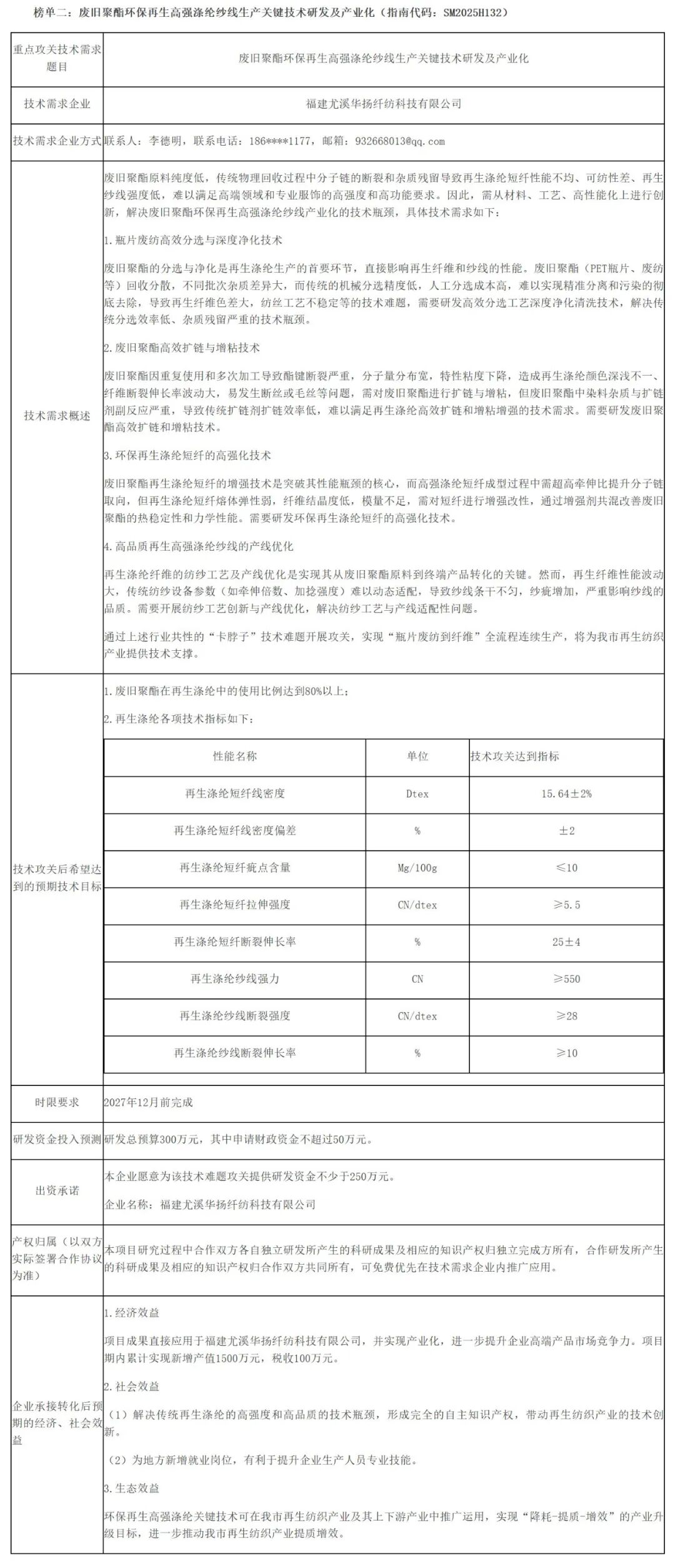 September 10, Sanming CityThe Bureau of Science and Technology issued a notice on the Announcement of the 2025 "Revealing the List and Taking Command" Project List in Sanming City.List Two: Research and Industrialization of Key Technologies for the Production of High-Strength Polyester Yarn from Waste Polyester for Environmental Recycling (Guideline Code: SM2025H132)