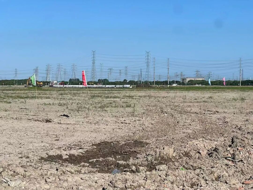 The excavator decorated with ribbons and a large red flower, which appeared in the news about the launch ceremony, is parked in a corner of the construction site. Looking from the entrance, one can only see from a distance the presumed central area of the future factory building, where earth excavation work is underway. On one side of the construction site, a row of large-diameter precast concrete pipes is neatly arranged.