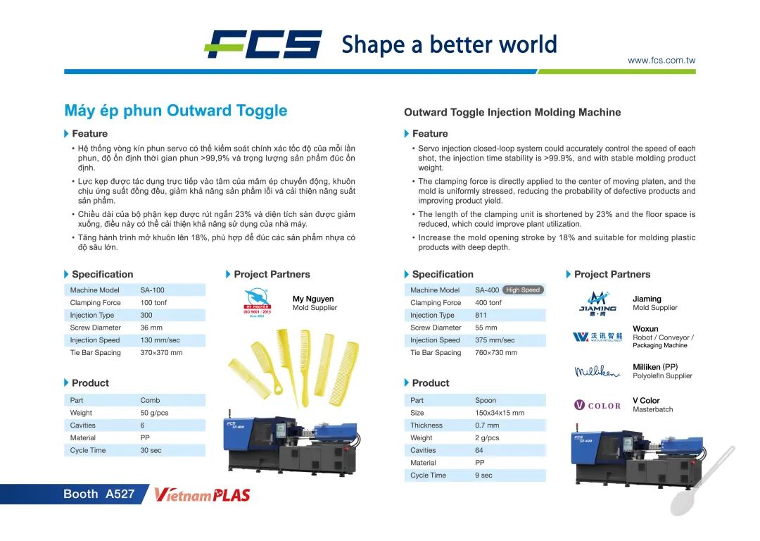 The SA series external elbow injection molding machine is FCS's newly launched energy-saving oil pressure servo injection molding machine, suitable for household consumer goods, stationery, automotive, 3C, and home appliance industries. It is particularly suitable for parts of multifunctional office machines, printers, computers, and other peripheral products, with a larger mold opening stroke that is also suitable for deep barrel-shaped products. The clamping force ranges from 100 to 3,200 tons. At this exhibition, the SA-400 high-speed machine produced 64-cavity disposable spoons on-site with a cycle time of 8.8 seconds, combined with automated packaging, meeting the local market demands.Thin-walled disposable product pairingThe demand for automation attracts a lot of people.