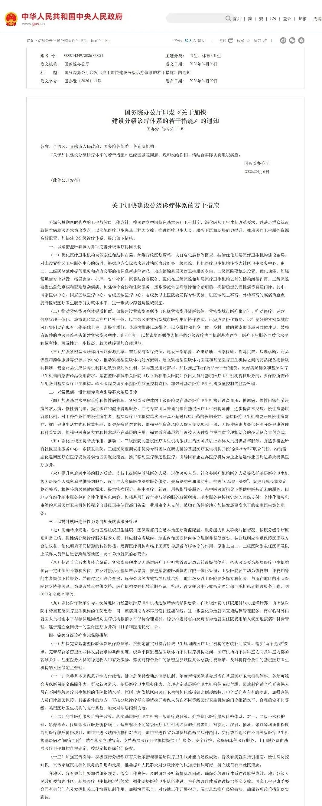 Recently, the General Office of the State Council issued the “Several Measures on Accelerating the Construction of a Tiered Medical Treatment System” (Guo Ban Fa [2026] No. 11), which outlines 13 specific measures across four key areas, clarifying the priority directions for building a tiered medical treatment system. The document stipulates that, by 2030, a coordinated tiered medical treatment mechanism, anchored by tightly integrated medical consortia, will be essentially established.