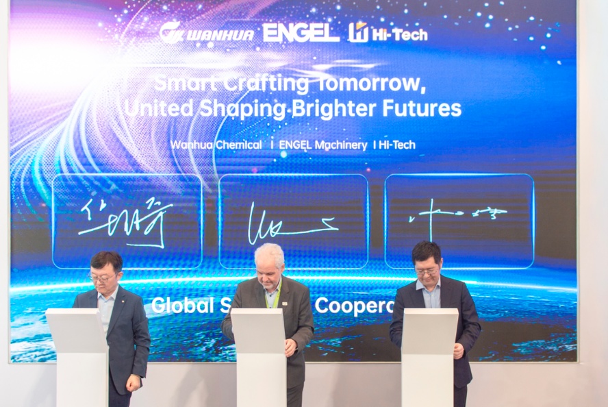 On October 10th, at the K Show for plastics and rubber in Düsseldorf, Germany, Haitac Chairman Sun Wenqiang signed a strategic cooperation agreement on behalf of the company with Wanhua Chemical and ENGEL. Hua Weiqi, Executive Vice President of Wanhua Chemical Group, and Gero Willmeroth, President of ENGEL Asia-Pacific, attended to witness the signing.