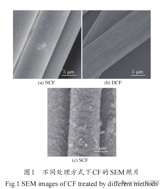 To reduce defects such as fuzz and breakage of CF due to friction and collision during production and transportation, commercial CF surfaces are also sized. However, different sizing agents have different properties with the matrix, and the concentration of commercial sizing agents is difficult to achieve the optimal effect. Therefore, the surface of CF is subjected to a degumming treatment. The CF is immersed in an acetone solution for 12 hours to remove the original sizing agent, then taken out and dried in an oven at 80°C for later use. The untreated and treated CF are referred to as NCF and DCF, respectively.