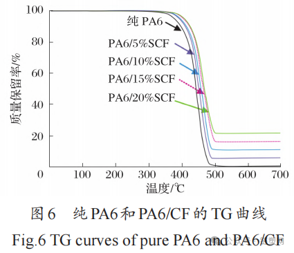 When the mass fraction of SCF is 5%, the t₀ of PA6/CF is 357℃.maxFor 465℃, wlos6.9%