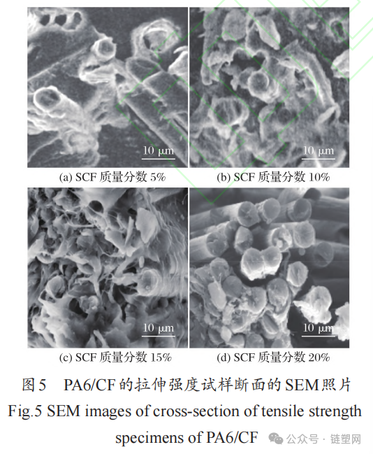 When the mass fraction of SCF is 5%~15%SCF is uniformly dispersed in the PA6 matrix, with PA6 resin wrapped around the fractured SCF, and the amount of SCF increases.