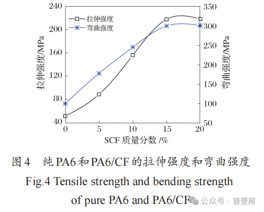 As the SCF content increases, the tensile strength and flexural strength of PA6/CF both initially increase significantly and then increase slowly. When the mass fraction of SCF is 15%, the tensile strength and flexural strength are improved by 316.4% and 198.8% compared to pure PA6.