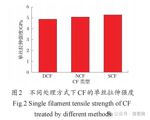 Figure 2 shows the single fiber tensile strength of CF under different treatment methods. From Figure 2, it can be seen that the single fiber tensile strength of DCF is 4.9 GPa, that of NCF is 5.1 GPa, and that of SCF is 5.3 GPa, indicating that SCF has the highest single fiber tensile strength, while DCF has the lowest.