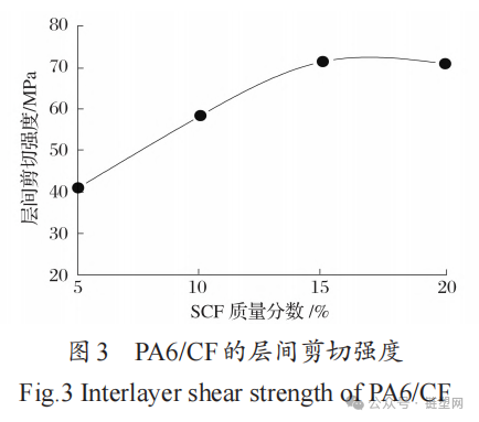 With the increase in SCF content, the interlaminar shear strength of PA6/CF initially increases significantly and then slightly decreases. The interlaminar shear strength reaches its maximum when the mass fraction of SCF is 15%.