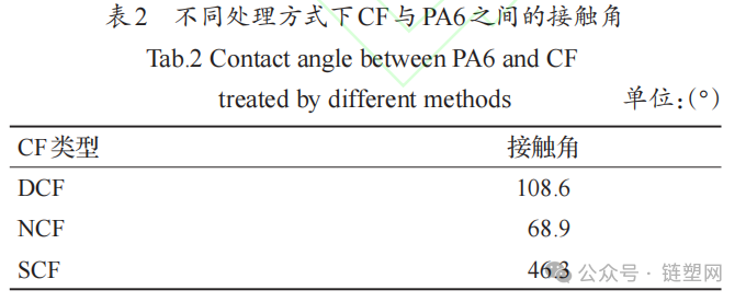 Table 2 shows the contact angles between CF and PA6 under different treatment methods. From Table 2, it can be seen that: