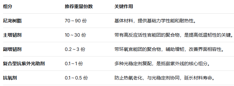 The following is recorded in a publicly available patent and has been verified to haveA nylon alloy formula with excellent low-temperature impact resistance and UV aging resistance, which can be used as a development reference: