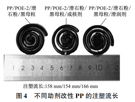 Figures 2 and 3 show the injection molding flow length and shear viscosity of different POE-modified PP, respectively.