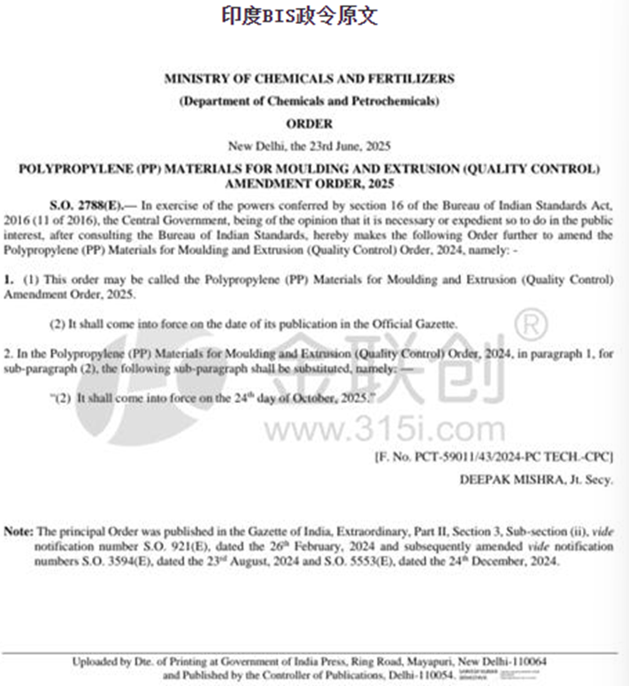 On June 23, the Indian government issued a notice stating that the department has amended the "2024 PP Molding and Extrusion Materials (Quality Control) Order," indicating that the order will take effect on October 24, 2025. This means that the BIS of India has postponed the PP import control to October 24. This is the third postponement since the order was proposed.