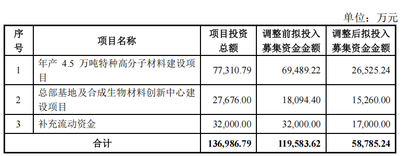 Previously, on May 22, 2023, the company issued RMB ordinary shares (A shares) to specific investors, raising a total fund of no more than RMB 1,195.8362 million, to invest in construction.The project involves the annual production of 45,000 tons of special polymer materials, as well as the headquarters base and the Synthetic Biomaterials Innovation Center project, etc. The actual fundraising for the project...The total amount approved for construction is RMB 599,999,989.68.