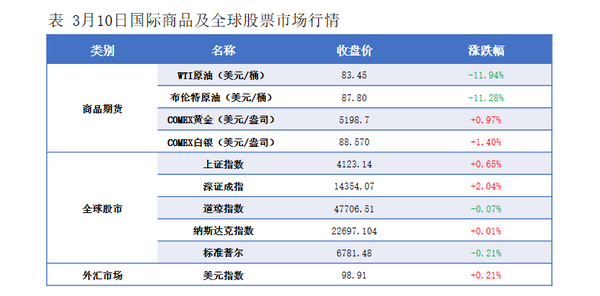 Markets believe the Israel-Iran conflict could end sooner than expected, coupled with the possibility that the G7 group may release strategic reserves, leading to a decline in international oil prices. NYMEX crude oil futures for the April contract fell $11.32 per barrel, or 11.94% month-over-month, to $83.45. ICE Brent crude futures for the May contract dropped $11.16 per barrel, or 11.28% month-over-month, to $87.80. China's INE crude oil futures for the April 2026 contract declined by 14.2 yuan to 732.4 yuan per barrel, and during the night session fell further by 90.4 yuan to 642 yuan per barrel.