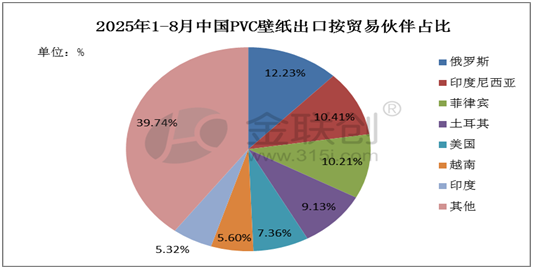 2025 1-8Based on the monthly data, our countryPVCThe average monthly export volume of wallpaper is0.58About 10,000 tons, excluding2Except for the lower months, the differences in other months are not significant. Additionally, our countryPVCThe top five export partners are Russia, Indonesia, the Philippines, Turkey, and the United States, with respective shares in the total exports.12.23%、10.41%、10.21%、9.13%、7.36%India is currently in China. PVC The ranking of wallpaper export trade partners is seventh, accounting for only 5.32%Left and right.