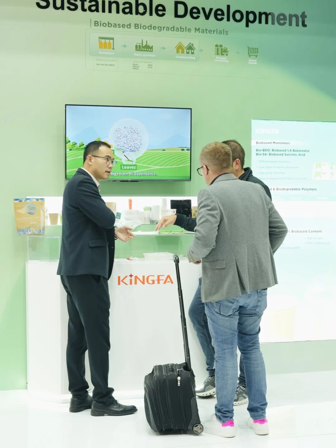 The sustainable development area is the soul of this exhibition booth. From bio-based monomers to bio-based PBT, and then to PBS, PLA, and other full series of biodegradable plastics, Kingfa Sci. & Tech. Co., Ltd. systematically showcases its entire industry chain layout in the field of "green chemistry." This is not just a display of materials but also a solemn commitment to the future of the Earth.