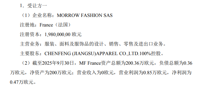 Morrow Fashion SAS, registered in France, is 100% owned by Jiangsu Chenfeng Garment. It has deep roots in the European high-end apparel fabric market and possesses mature experience in brand operation and European channel expansion. This perfectly complements Luthai A's shortcomings in the high-end European terminal market.