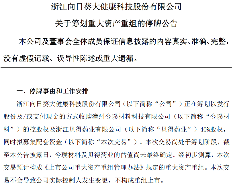 On September 21, Zhejiang Sunflower Health Technology Co., Ltd. announced that the company intends to acquire 100% equity of Zhangzhou Xipu Materials Technology Co., Ltd. (Xipu Materials) and 40% equity of Zhejiang Beid Pharmaceutical Co., Ltd. (Beid Pharmaceutical) through the issuance of shares and cash payment, and to raise matching funds.