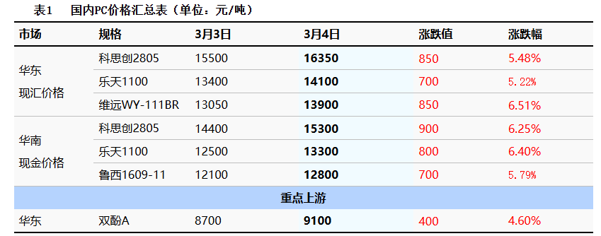 Table 2 Domestic PC Data Overview (Unit: RMB/ton)