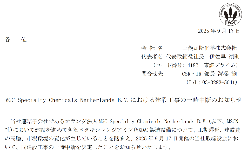 Mitsubishi Gas Chemical Company, Inc. (MGC) announced that at the board meeting held on September 17, 2025, it was decided to suspend the construction of the m-xylene diamine (MXDA) production facility at its Dutch subsidiary, MGC Specialty Chemicals Netherlands B.V. (referred to as "MSCN"). The reasons for the suspension include construction delays, a significant increase in construction costs, and changes in the market environment.