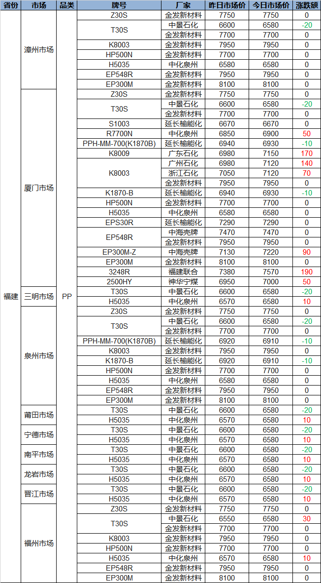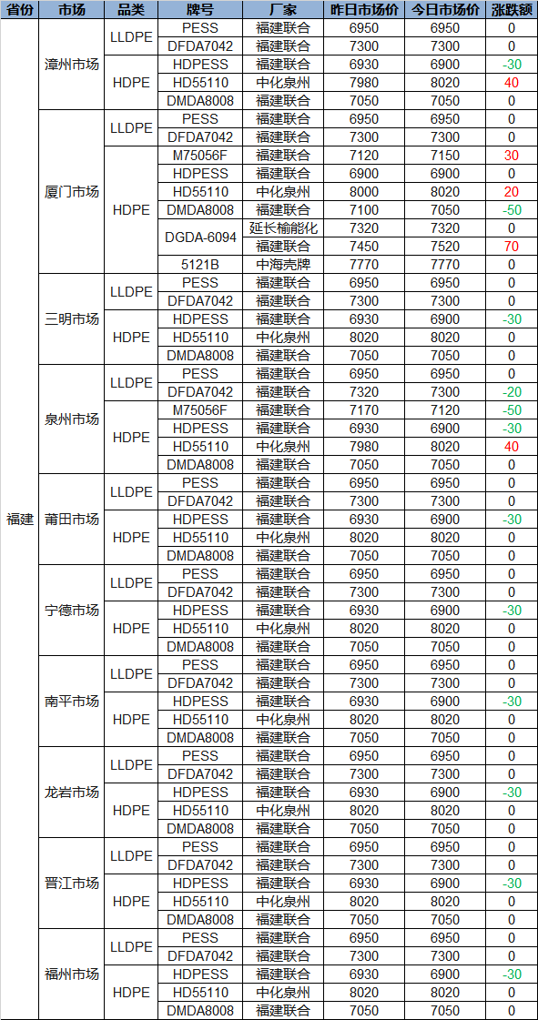 Narrow Fluctuation in Fujian Plastics Prices Today: PE Partially Up or Down 20-70, PP Up to 190