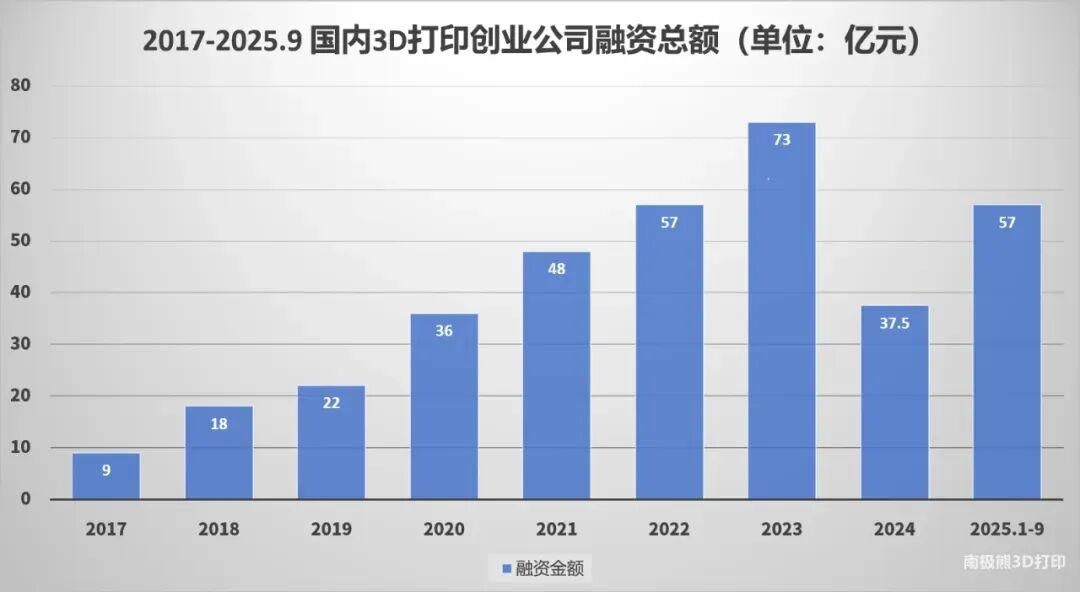 Recently, Nanji Bear reviewed the situation of 3D printing companies that received venture capital before the third quarter of 2025 and found that the situation is undergoing new changes. By the third quarter of 2025, Nanji Bear recorded that 61 3D printing companies collectively received 73 rounds of financing, with a total investment amount of approximately 5.7 billion yuan, already surpassing the entire last year. If efforts continue in the fourth quarter, the total financing amount is likely to exceed 7.3 billion yuan in 2023. In terms of large-scale investment and financing, almost every month there are major financing events involving amounts of over 200 million yuan.