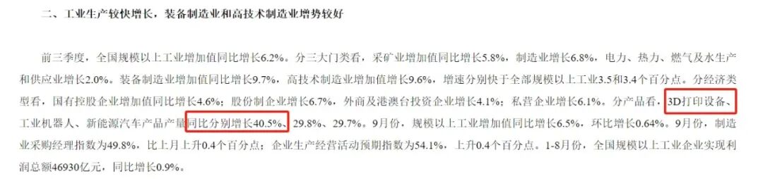 Among them, the growth of 3D printing equipment has once again become a key focus of the National Bureau of Statistics, with a growth rate surpassing that of industrial robots and new energy vehicles. "Looking at it by product,"3D printing equipmentIndustrial robots, new energy vehicle production outputIncreased by 40.5% year-on-year.、29.8%、29.7%。”