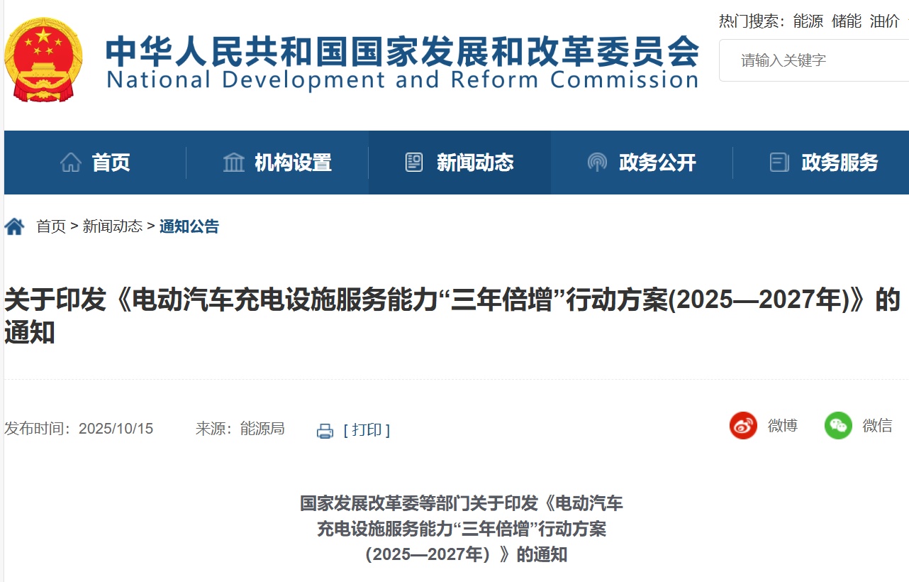 On October 15, the National Development and Reform Commission and other departments issued the "Three-Year Doubling Action Plan for Electric Vehicle Charging Facility Service Capacity (2025-2027)", proposing that by the end of 2027, 28 million charging facilities will be built nationwide, providing over 300 million kilowatts of public charging capacity, meeting the charging needs of over 80 million electric vehicles, and achieving a doubling of charging service capacity.