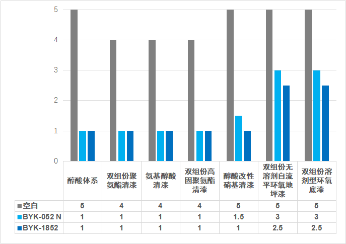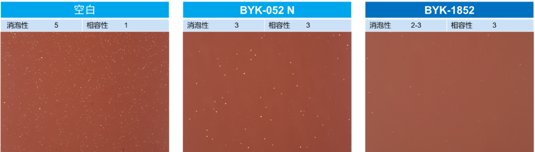 In different coating systems, the new product BYK-1852 shows superior defoaming performance compared to BYK-052 N, slightly outperforming it in multiple systems while retaining the same system compatibility as BYK-052 N. BYK-1852 can almost always directly replace BYK-052 N in all scenarios.
