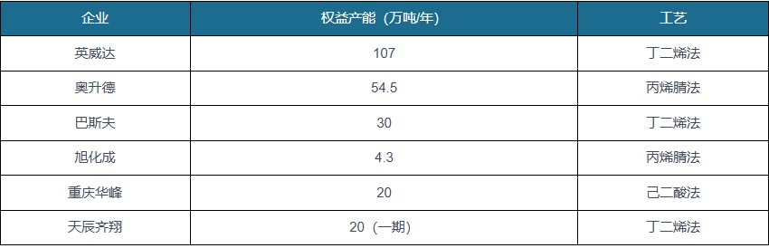 Table: Global Adiponitrile Production Capacity and Process in Operation (Source: Guanyan Tianxia Compilation)