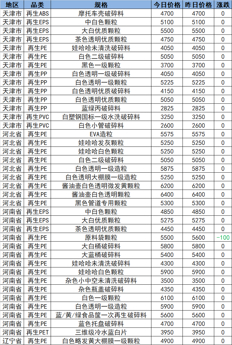 Summary: New prices for the North China recycled plastics market on the morning of December 15th! The North China recycled market saw individual declines, with recycled PE in Henan dropping by 100 to report between 3500-6100; recycled PVC in Tianjin reported between 2600-3250; recycled PE in Liaoning reported at 4900. The market is operating with a steady and calm adjustment, downstream stocking sentiment is cautious, trading atmosphere is not high, and actual transactions are subject to price negotiation.