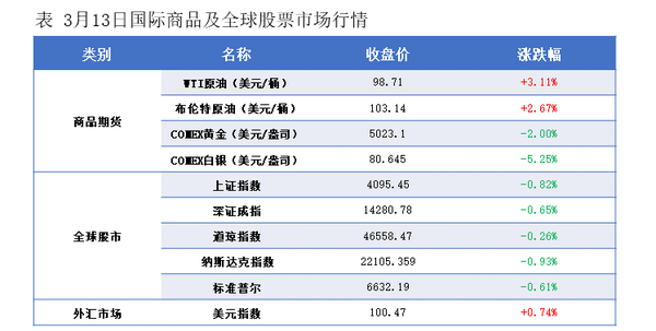 ◎3/13: The conflict between Israel and Iran continues, and the US may increase its military presence, raising supply risks, leading to an increase in international oil prices. NYMEX crude oil futures 04 contract rose by $2.98 to $98.71 per barrel, a 3.11% increase; ICE Brent crude futures 05 contract increased by $2.68 to $103.14 per barrel, a 2.67% increase. China's INE crude oil futures 2605 contract rose by 39.9 to 754.5 yuan per barrel, and in the night session, it increased by 35 to 789.5 yuan per barrel.
