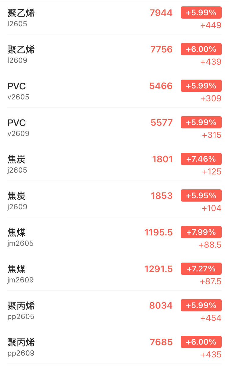 The PP2605 contract is quoted at 8,034 yuan/ton, up 5.99% from the previous trading day.