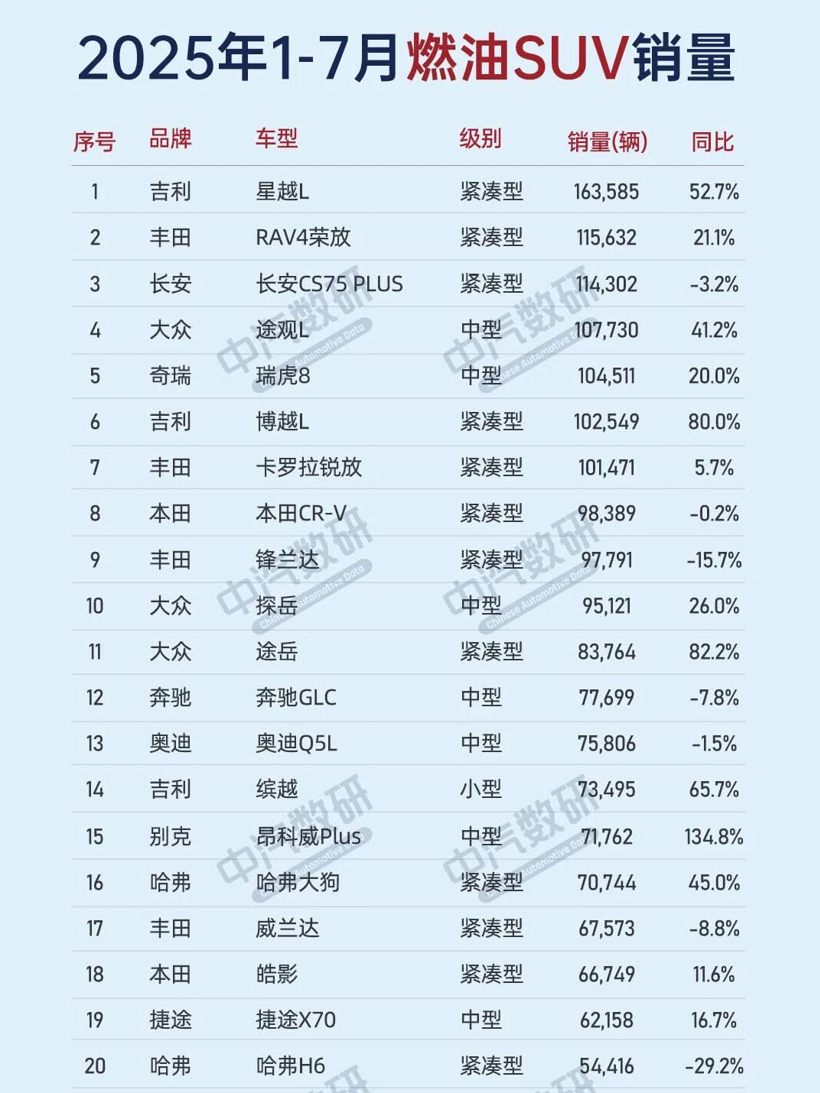 According to data from the China Automotive Research Institute, the Geely Xingyue L ranked first in fuel vehicle sales from January to July 2025, with sales of 163,600 units, a year-on-year increase of 52.7%. This compact SUV, priced around 150,000 yuan, outperformed classic joint venture models such as the Toyota RAV4 and Volkswagen Tiguan L, with sales even surpassing iconic sedans like the Nissan Sylphy, Volkswagen Lavida, and Sagitar. In addition, the sales of Geely Boyue L and Xingrui have also continued to grow in their respective market segments, achieving a lead over joint venture brands and becoming a focal point of market attention.
