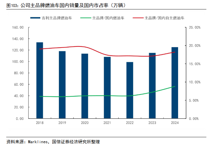 A research report by Guoxin Securities shows that from 2018 to 2022, the market share of the Geely main brand in the fuel vehicle market remained stable at around 6%. By 2024, the market share of the Geely main brand in the fuel vehicle industry and among independent brand fuel vehicles will rise to 8.81% and 18.21%, respectively, with significant results.