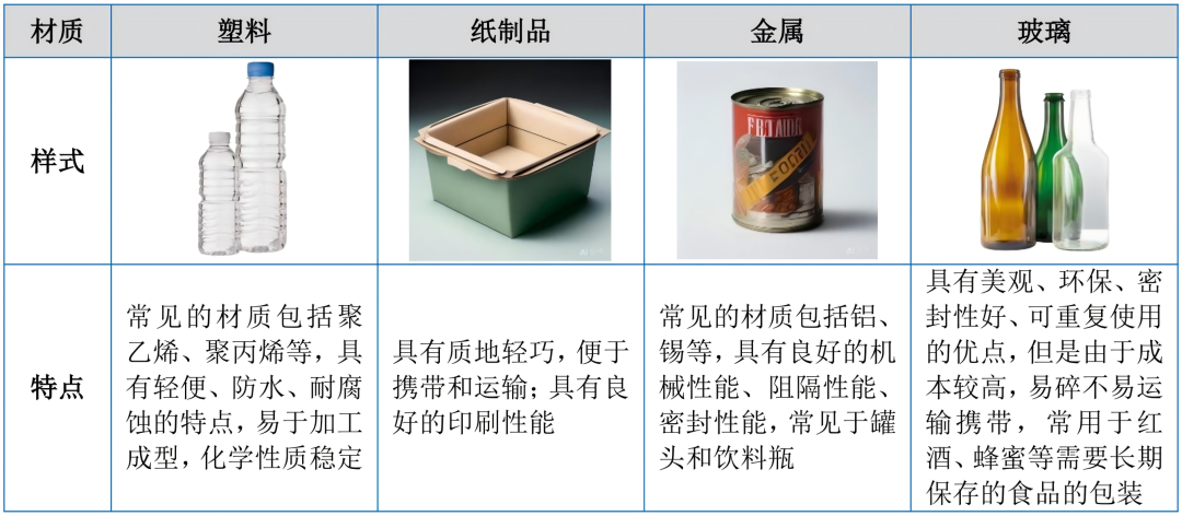 Food containers can be classified by material into plastic, paper products, metal, and glass. Due to their different characteristics, the application fields of different materials also vary. Among them, plastic and paper products have become the most important components of food container materials due to their excellent performance and lower cost. The comparison of food containers made from different materials is as follows: