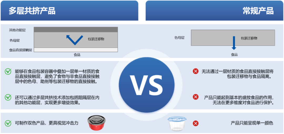 Compared to conventional products that are directly formed from a single formulation of raw materials, food container products manufactured using multi-layer co-extrusion technology under the thermoforming process can organically combine the advantageous properties of various formulations. Their functionality and aesthetics are more prominent, with specific comparisons as follows: