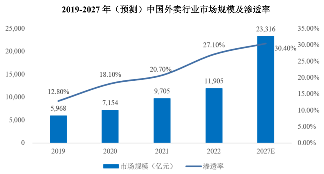 At the same time, with the increasingly fast pace of people's lives, the penetration rate of the food delivery industry in China has been rising year by year, and the market size has been expanding rapidly. According to data from Frost & Sullivan, the size of China's food delivery industry grew from 596.8 billion yuan in 2019 to 1,190.5 billion yuan in 2022, with the penetration rate increasing from 12.80% to 27.10%. It is expected that by 2027, the size of China's food delivery industry will reach 2,331.6 billion yuan, with a penetration rate of 30.40%. The continuous expansion of the downstream food delivery market has laid a solid foundation for the sustained development of the company's business.