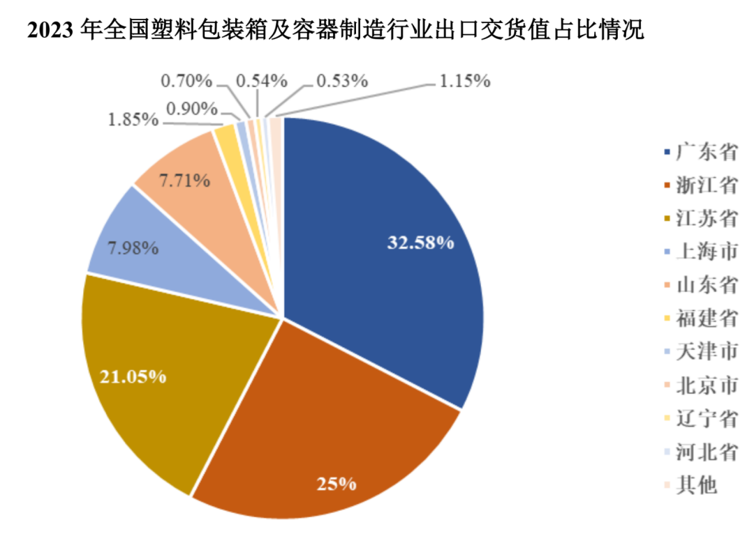 The production side of China's food packaging container industry exhibits a noticeable regionality. Thanks to a favorable political and business environment, comprehensive industry support, coastal location, and convenient transportation and logistics, the industry is primarily concentrated in the eastern coastal areas, showing significant industry clustering characteristics. According to data from the China Packaging Federation, Guangdong Province, Zhejiang Province, and Jiangsu Province rank as the top three in terms of export delivery value in China's plastic packaging box and container manufacturing industry, collectively accounting for 78.63%.